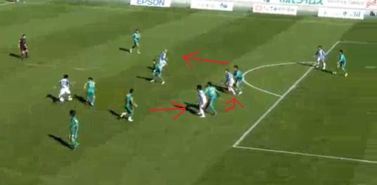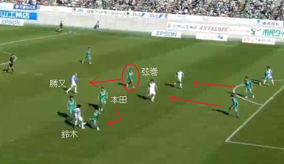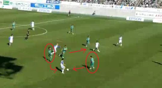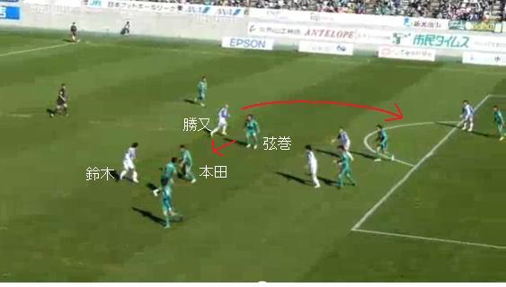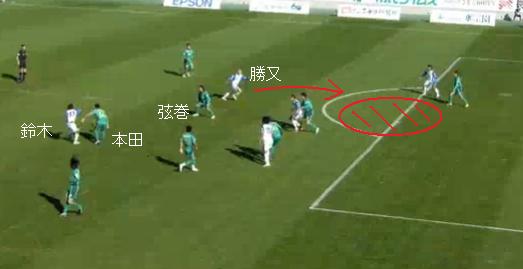 勝又選手が鈴木選手にパスを出した(29秒くらい)場面を切りだすとこうなります(画像荒くてスミマセン)。